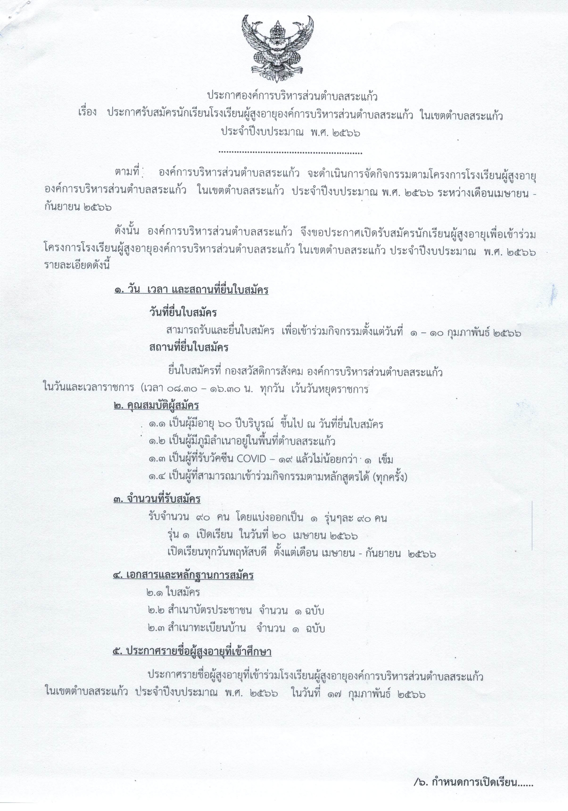 ประกาศองค์การบริหารส่วนตำบลสระแก้ว เรื่อง ประกาศรับสมัครนักเรียนโรงเรียนผู้สูงอายุองค์การบริหารส่วตำบลสระแก้ว ในเขตตำบลสระแก้ว ประจำปีงบประมาณ พ.ศ. 2566