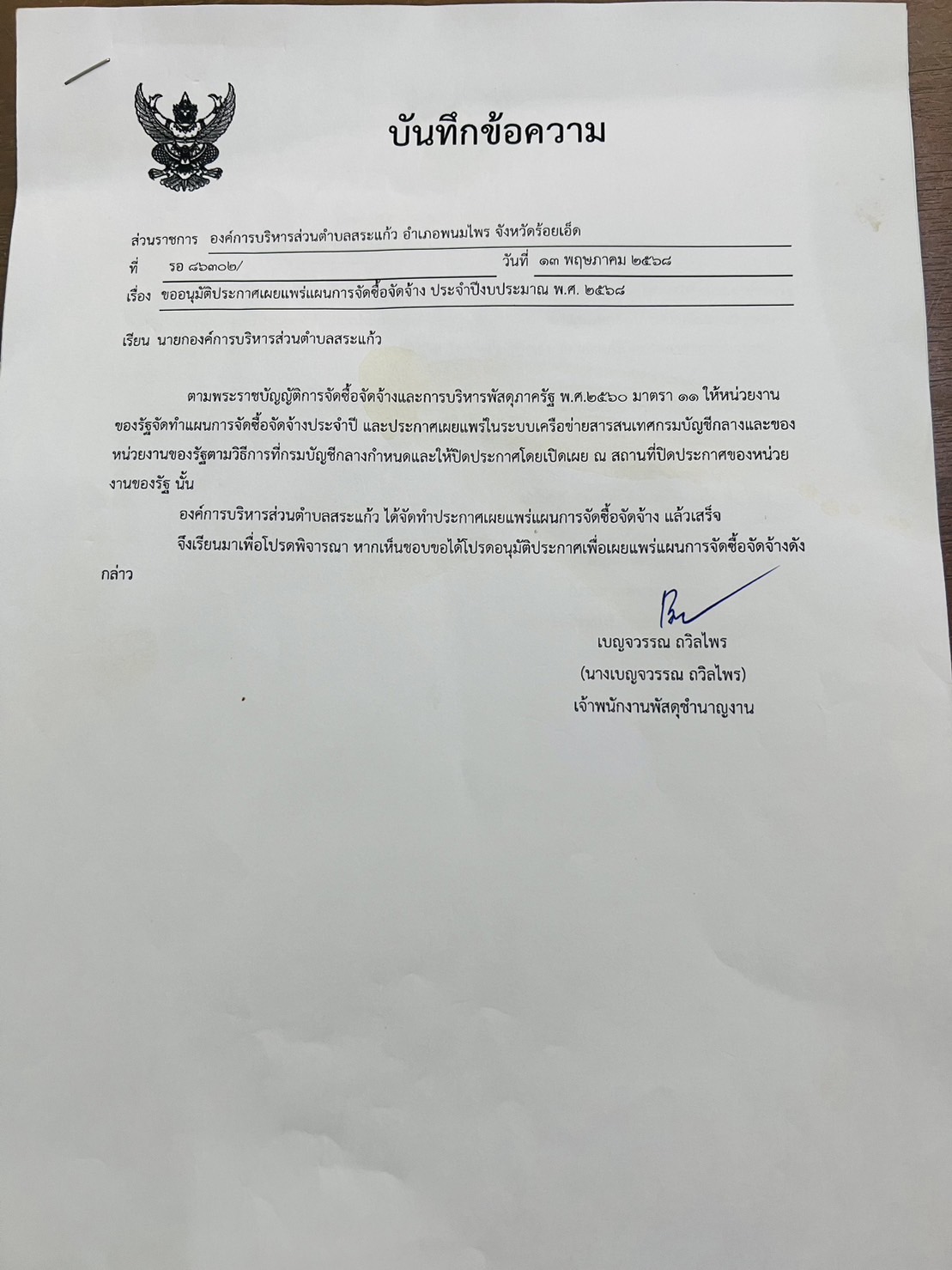 ประกาศองค์การบริหารส่วนตำบลสระแก้ว เรื่อง ขออนุมัติประกาศเผยแพร่แผนการจัดซื้อจัดจ้าง ประจำปีงบประมาณ พ.ศ.๒๕๖๘