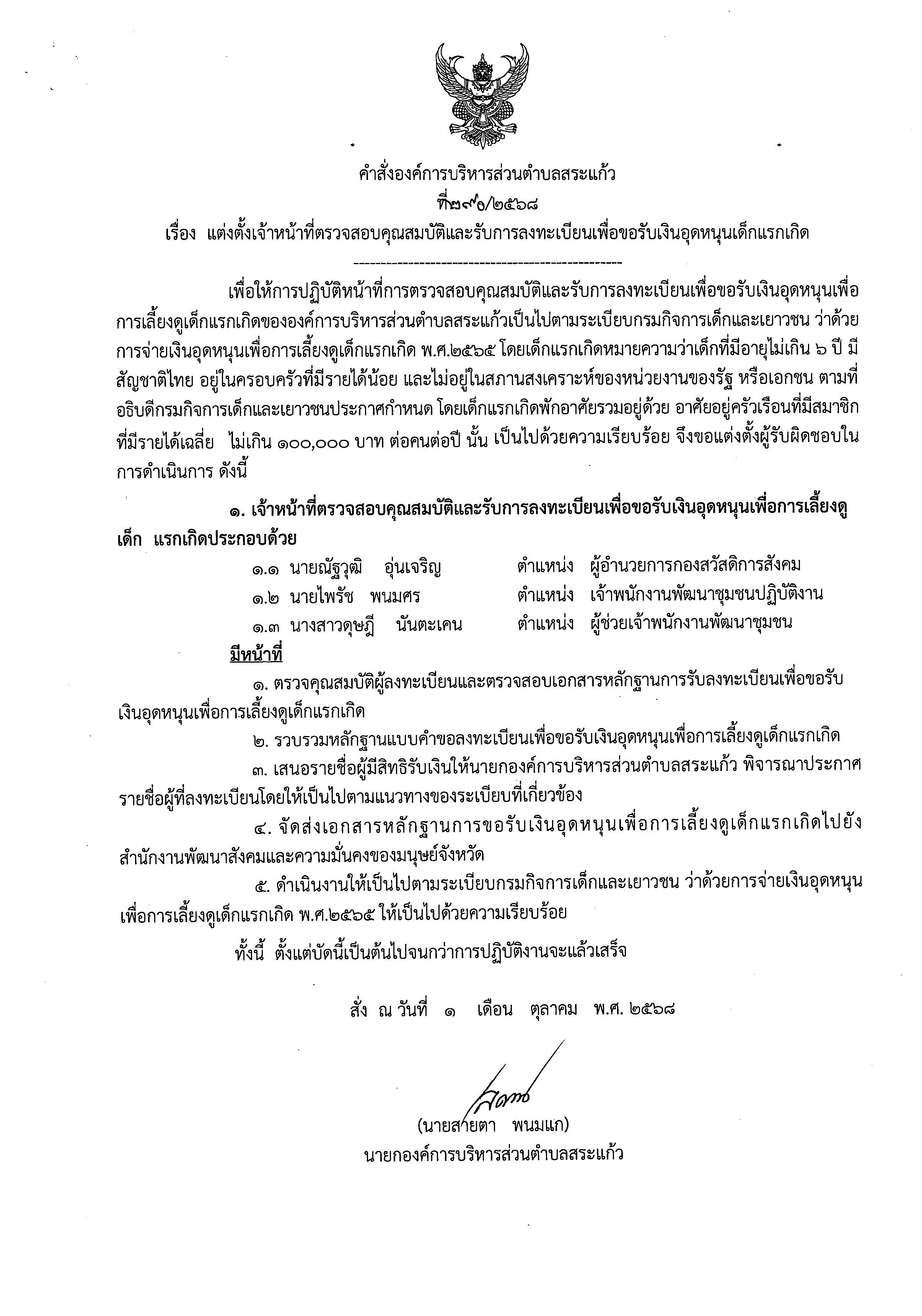ประกาศ องค์การบริหารส่วนตำบลสระแก้ว เรื่อง แต่งตั้งเจ้าหน้าที่ตรวจสอบคุณสมบัติและรับการลงทะเบียนเพื่อขอรับเงินอุดหนุนเด็กเเรกเกิด