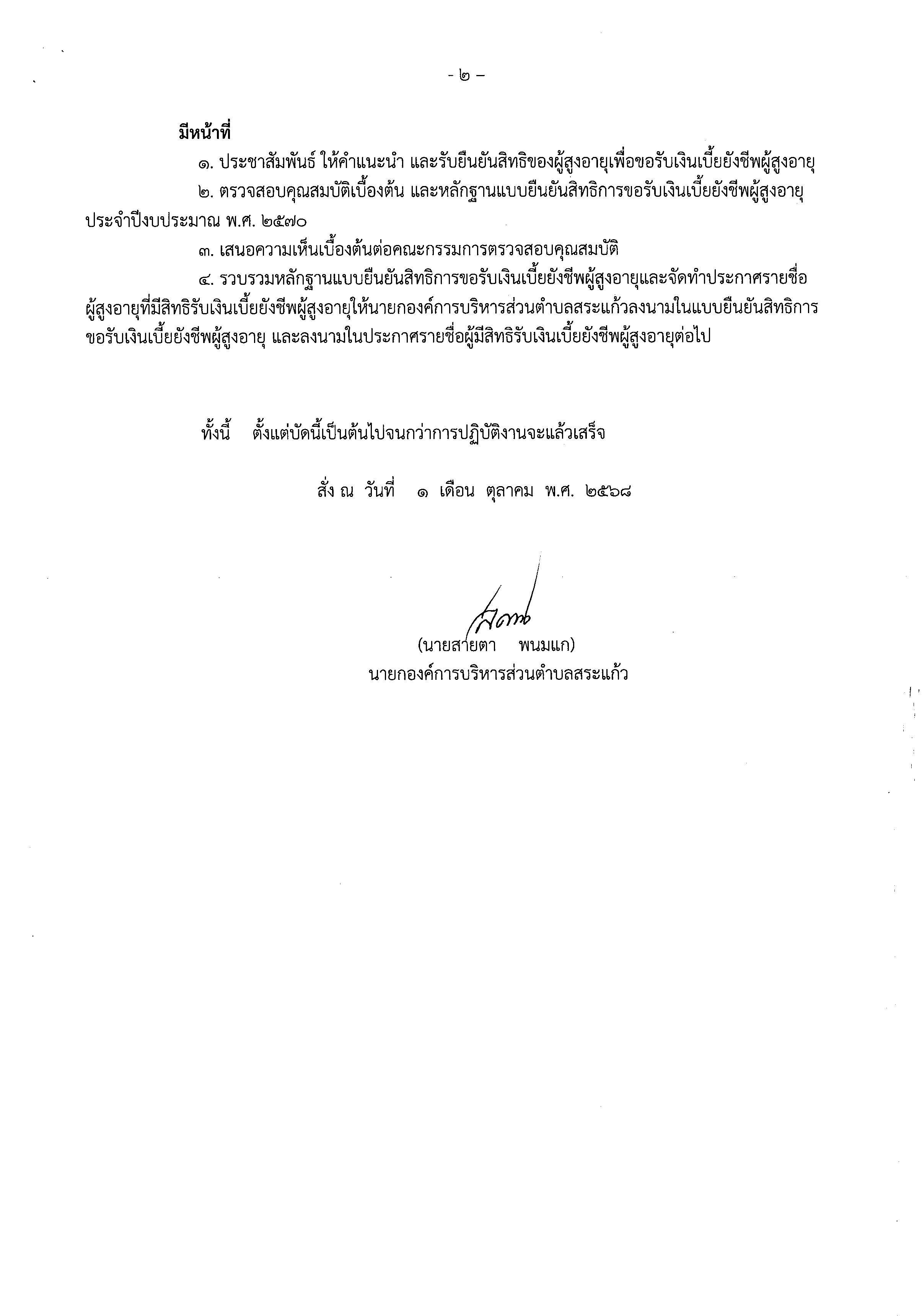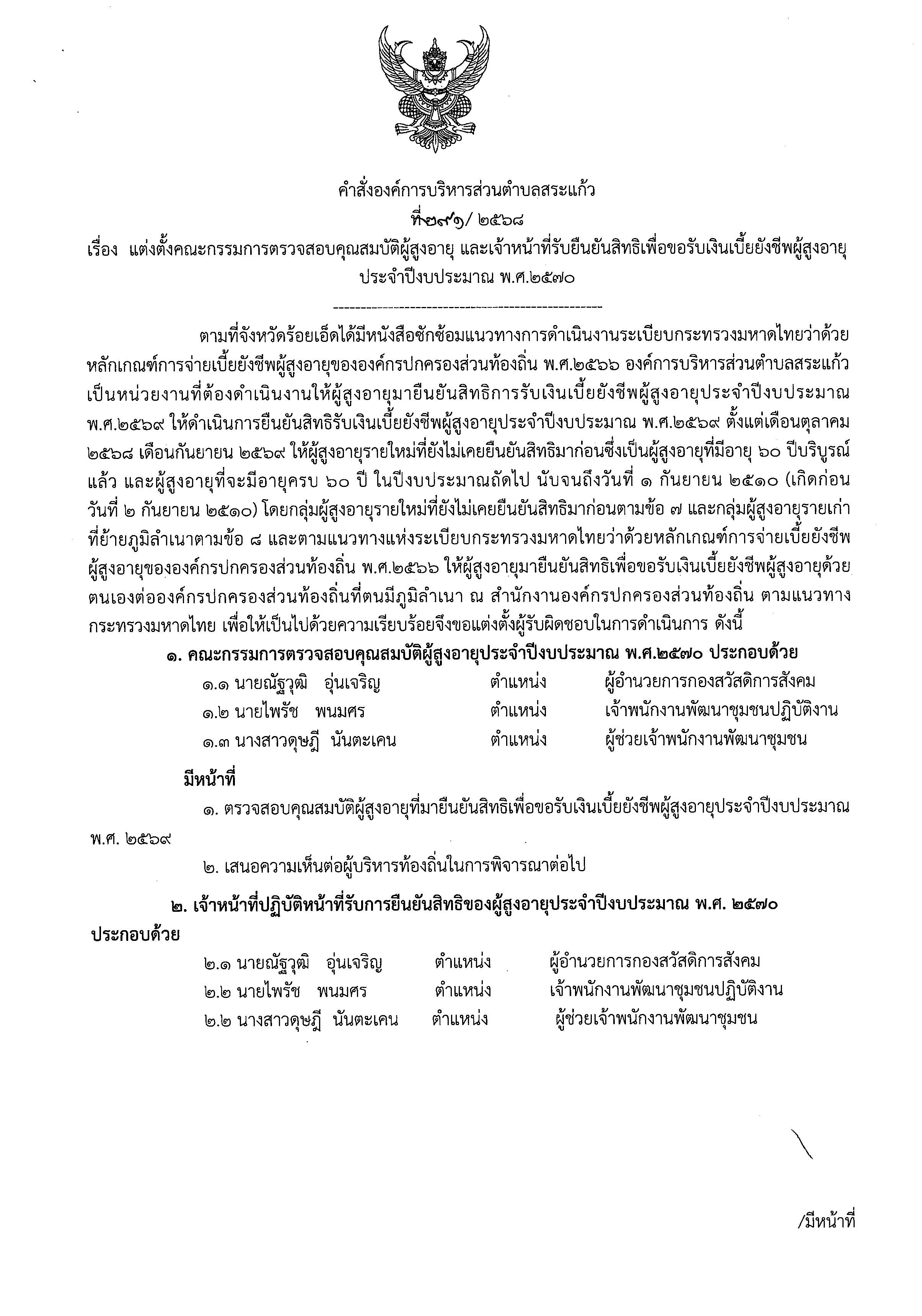 ประกาศองค์การบริหารส่วนตำบลสระแก้ว เรื่อง แต่งตั้งคณะกรรมการตรวจสอบคุณสมบัติผู้สูงอายุและเจ้าหน้าที่รับยืนยันสิทธิเพื่อขอรับเงินเบี้ยยังชีพผู้อายุ ประจำปีงบประมาณ พ.ศ.2570
