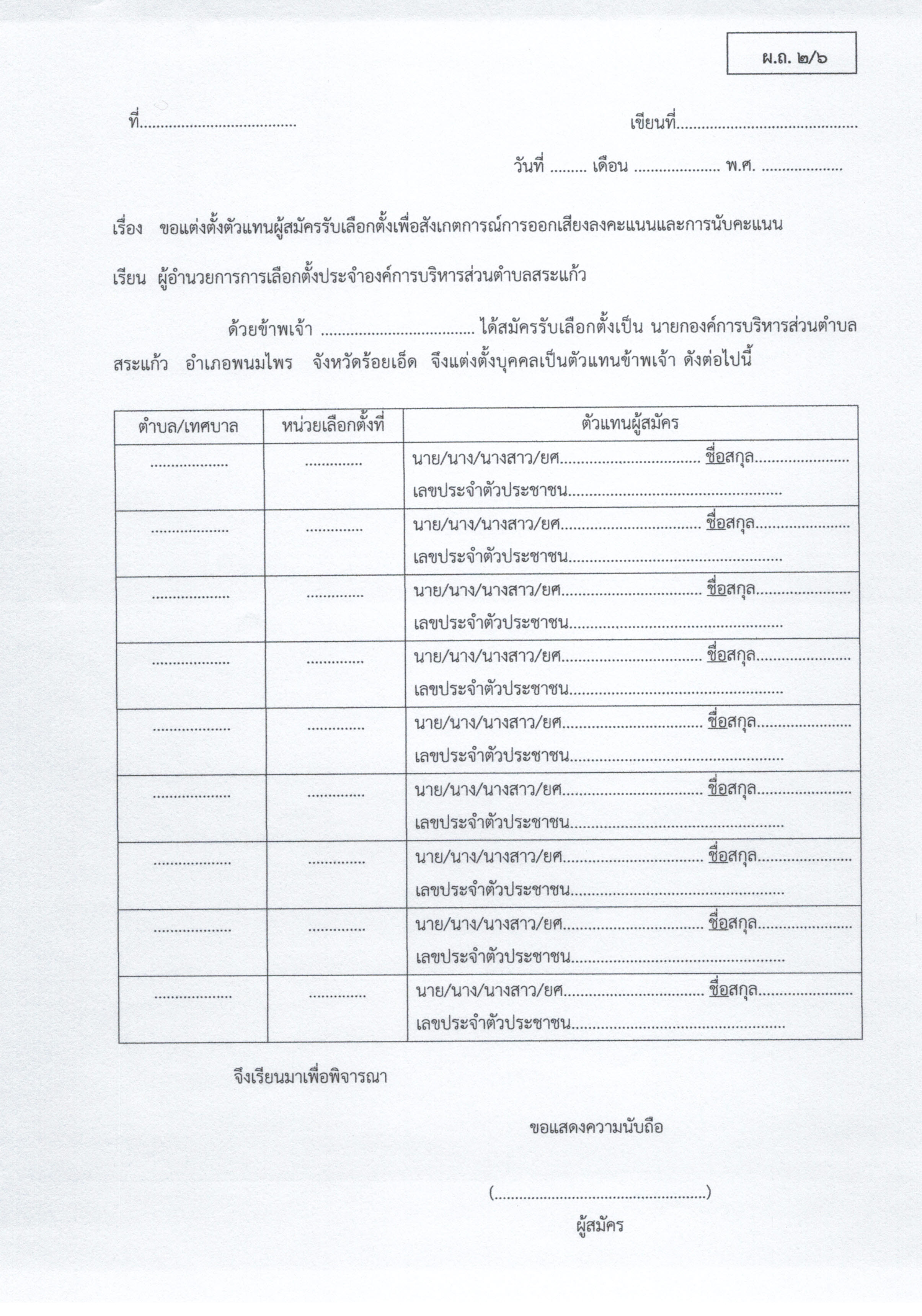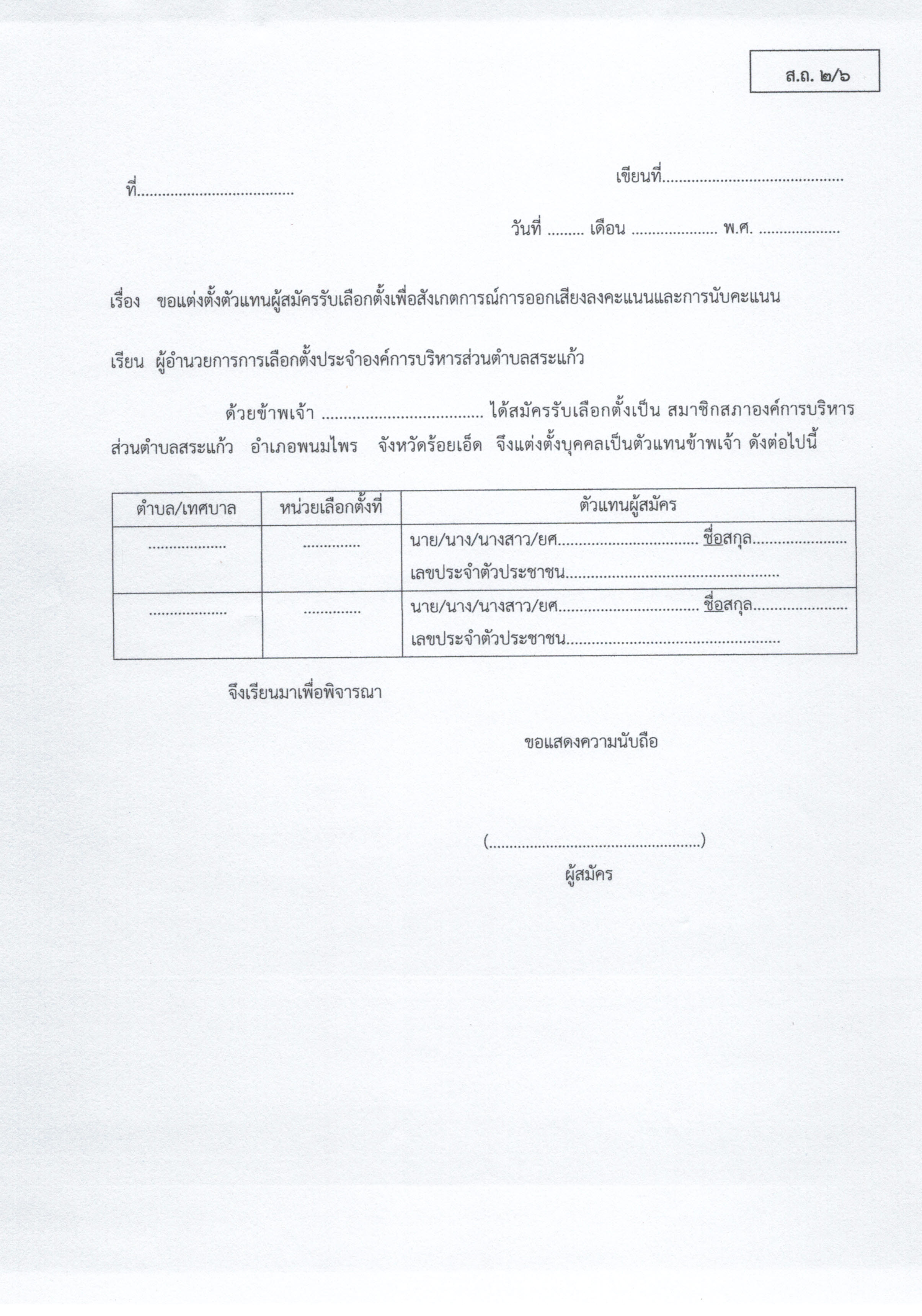 ส.ถ./ผ.ถ 2/6 ขอแต่งตั้งตัวแทนผู้สมัครรับเลือกตั้งเพื่อสังเกตการณ์การออกเสียงลงคะแนนและการนับคะแนน
