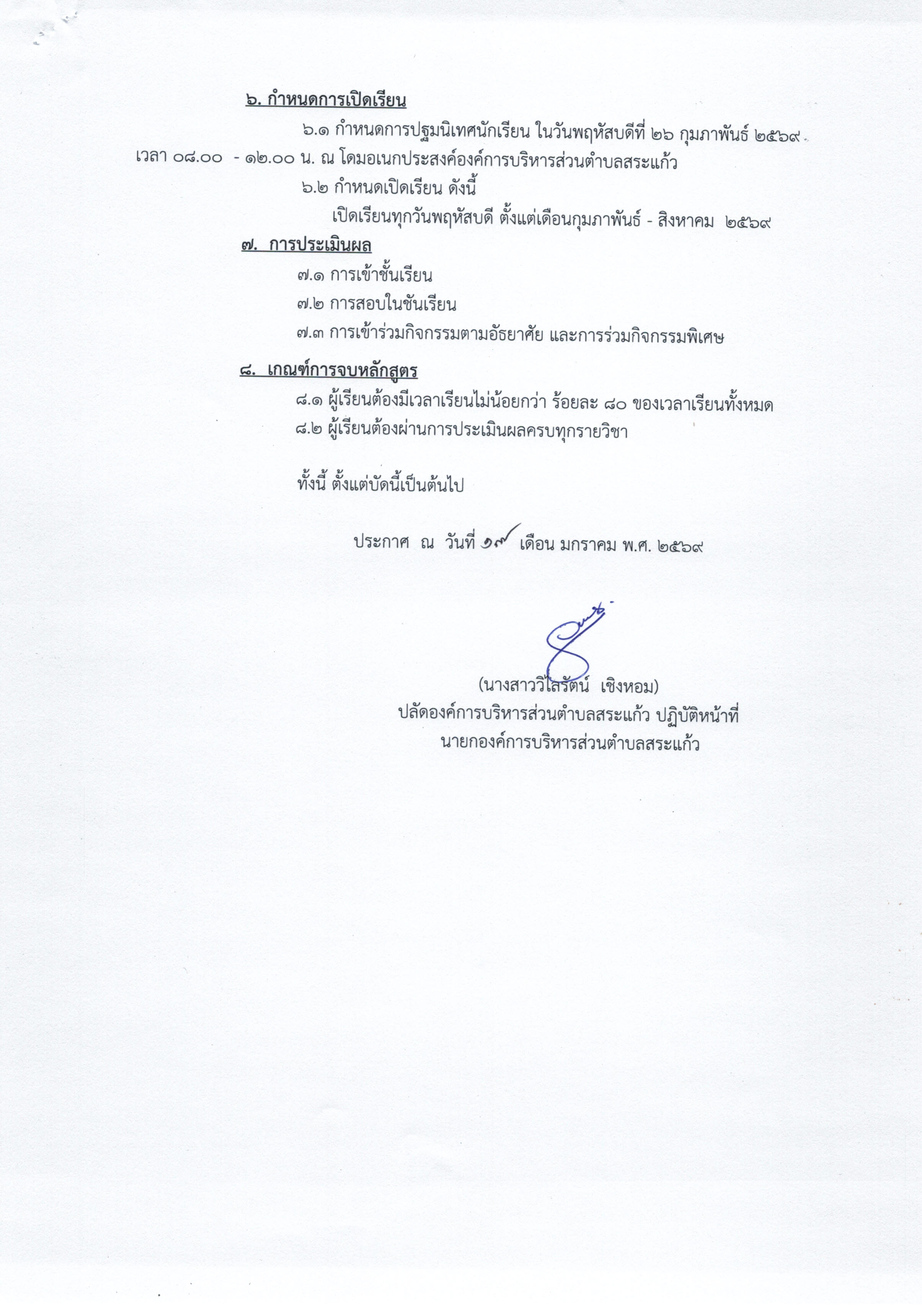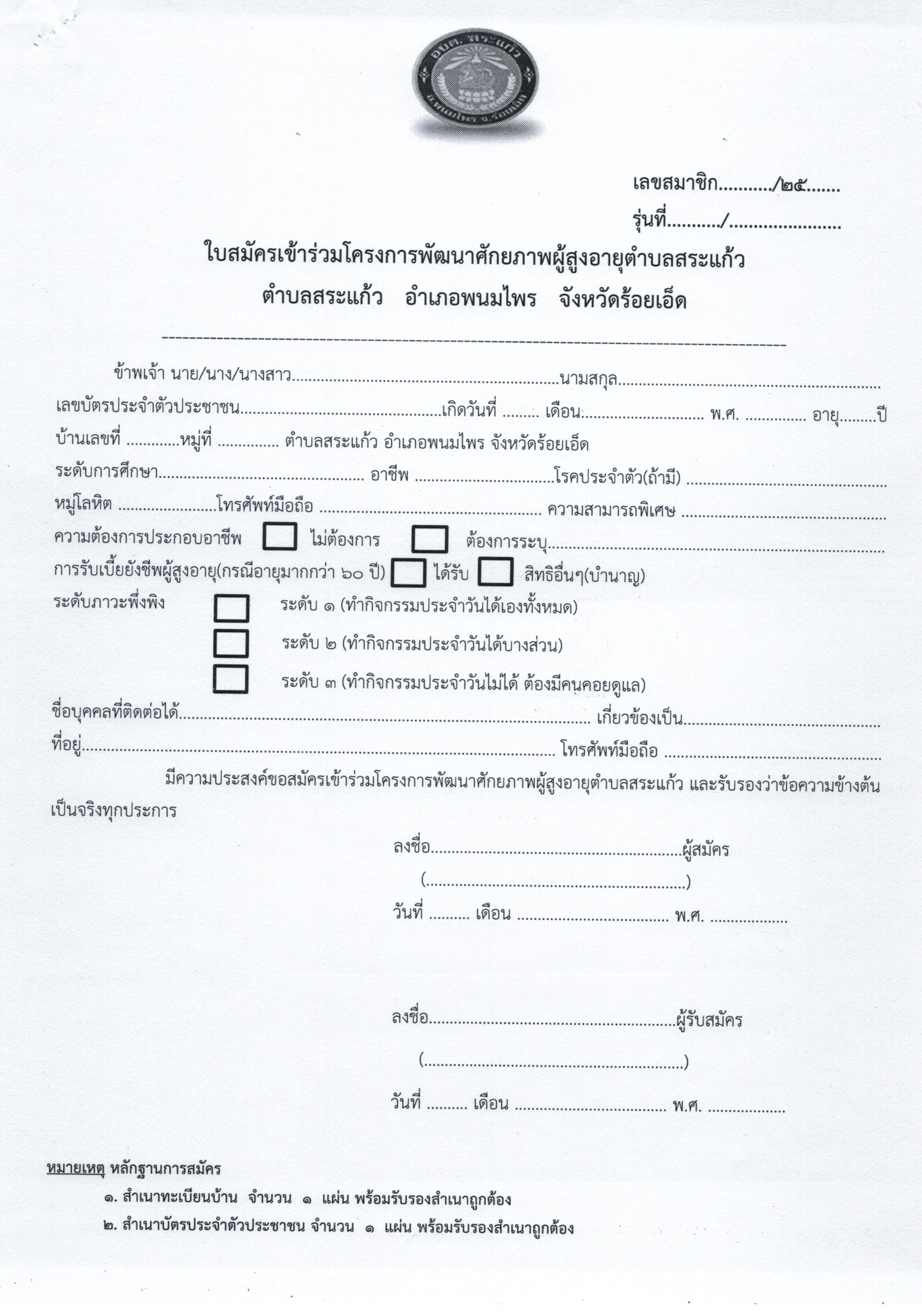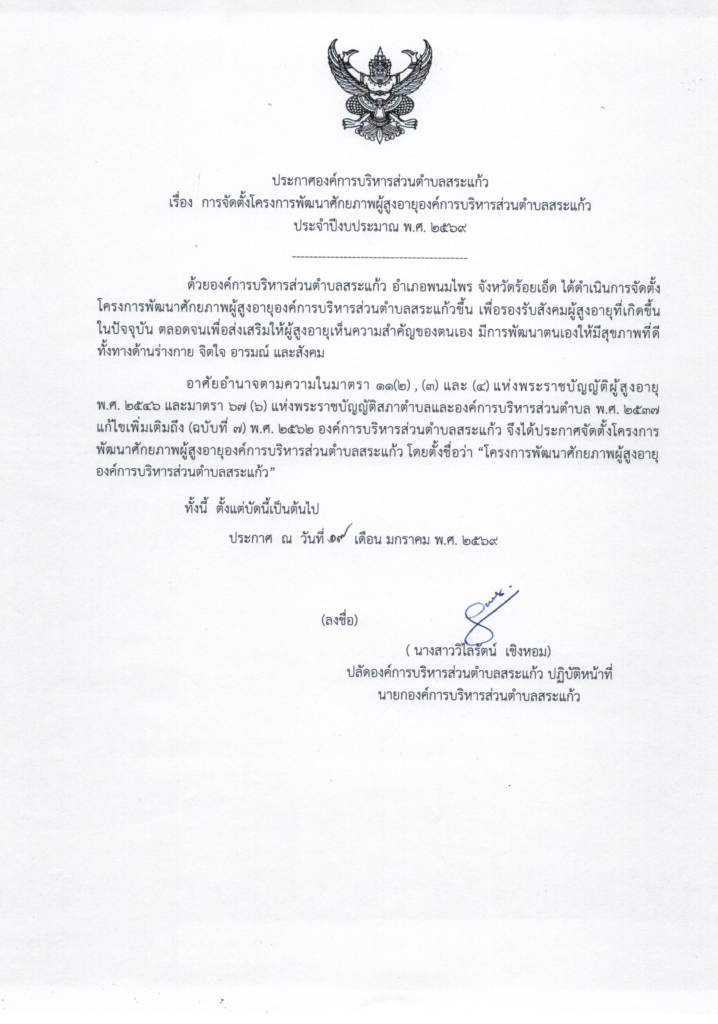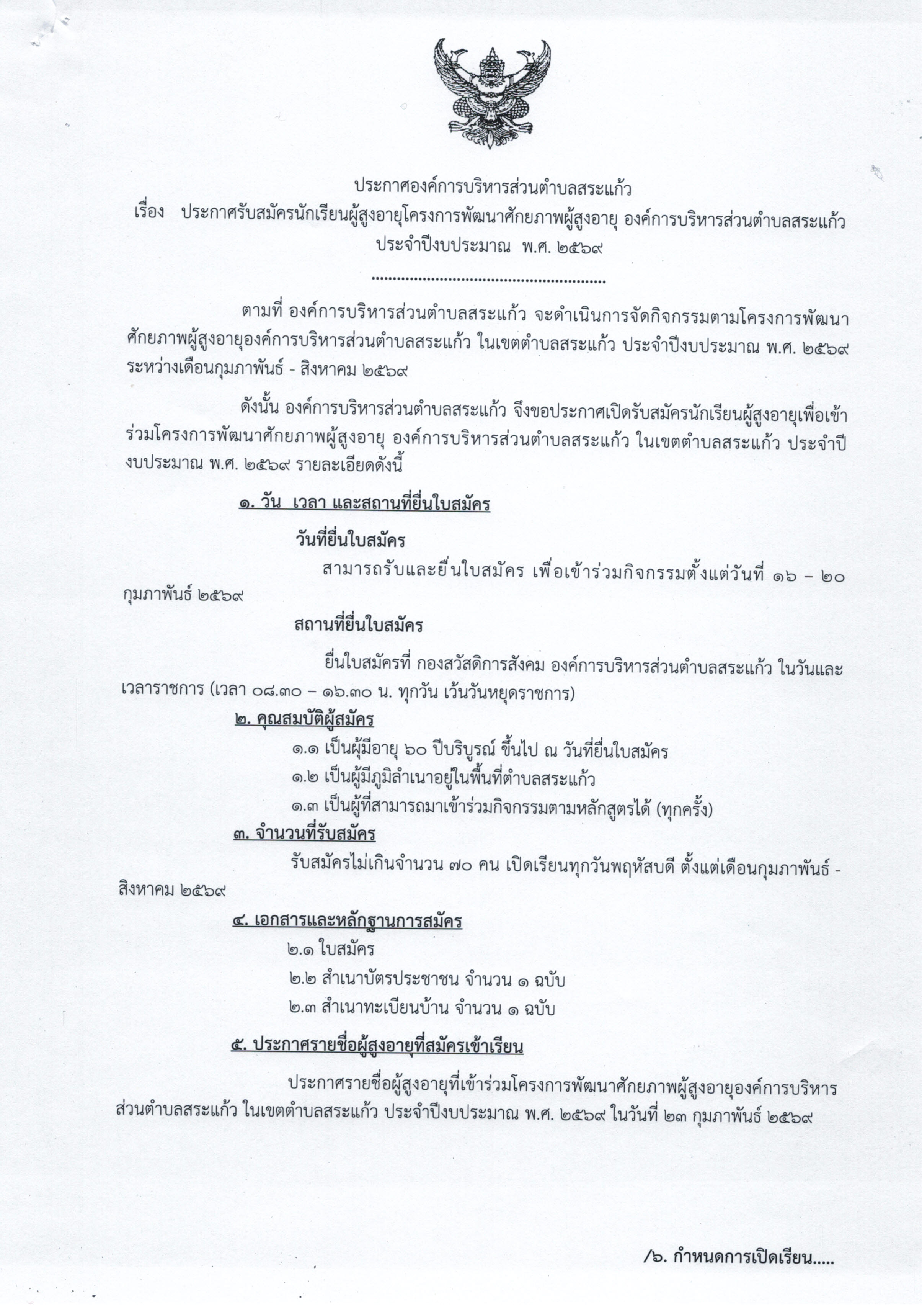 ประกาศรับสมัครนักเรียนผู้สูงอายุโครงการพัฒนาศักยภาพผู้สูงอายุ องค์การบริหารส่วนตำบลสระแก้ว ประจำปีงบประมาณ พ.ศ. 2569